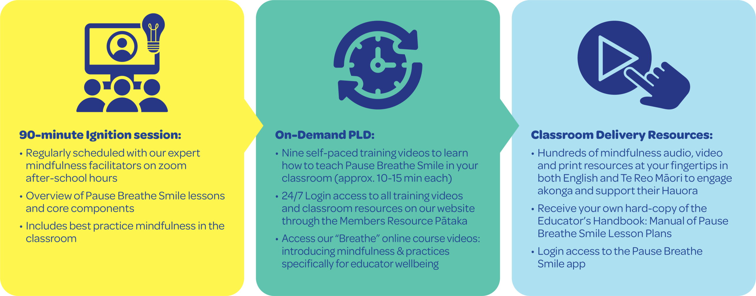 Our expert facilitators train teachers who then implement the Pause Breathe Smile programme with their learners. We empower educators with the evidence-based programme and supporting resources, ensuring the knowledge and application lie in the hands of those well-suited to support tamariki. Once the formal programme has been taught to children, educators are then able to practice and revisit elements throughout the year, as and when needed.